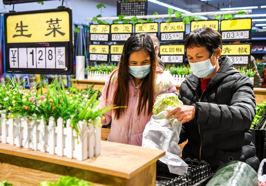 1月18日,居民在廣西興業(yè)縣“老鄉(xiāng)家園”配套建設(shè)的平價超市內(nèi)購買蔬菜。新華社記者 曹祎銘 攝
