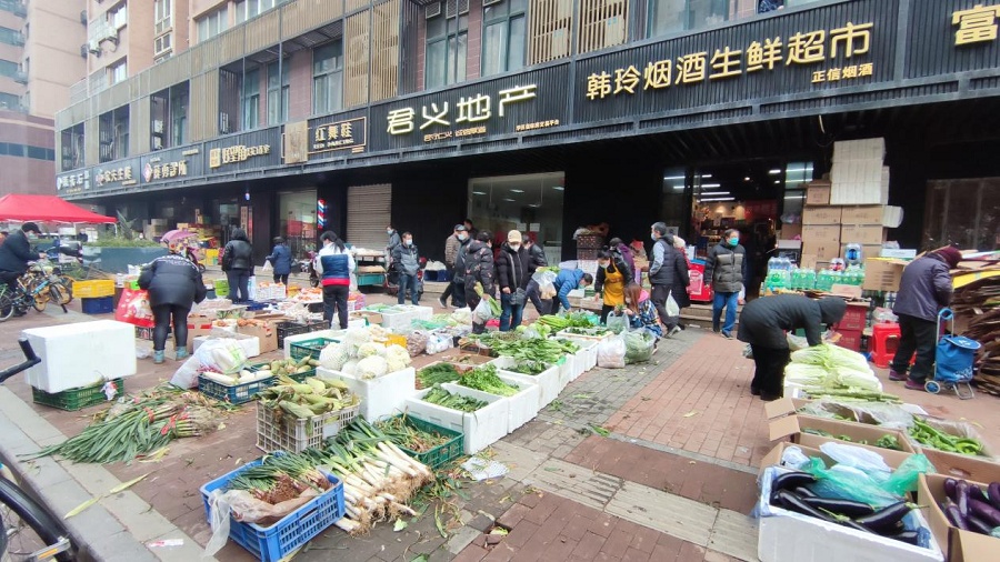 走出超市,漫步街邊,沿街陸續(xù)開業(yè)的小商鋪,同樣展現(xiàn)著這個(gè)城市久違的活力。在楓葉廣場(chǎng)2期小區(qū)西南門,正在營(yíng)業(yè)的蔬菜店、水果店生意很是不錯(cuò),新鮮的茄子、青筍、白菜用紙箱裝著,被整整齊齊地?cái)[在沿街人行道上,不少市民正在選購(gòu)心儀的菜品。