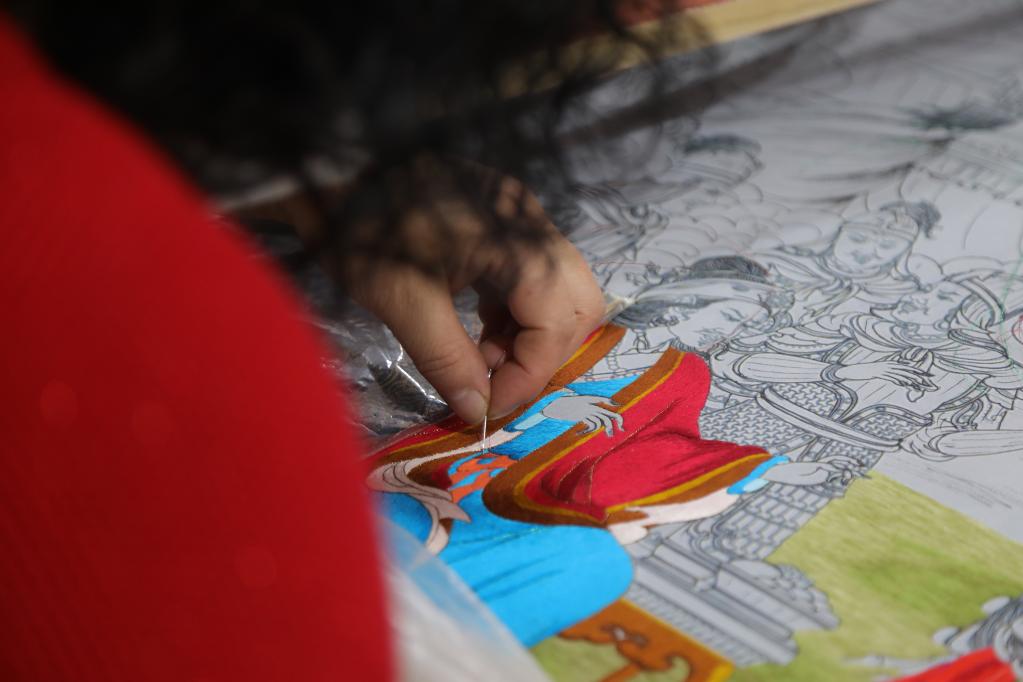 平滑的線條、細膩的針腳、傳統(tǒng)的繡法、新穎的設計……繡坊內,繡娘們聚精會神穿針引線,拉毛葉忠仔細檢查繡娘們的作品,用藏繡技藝講述格薩爾王的故事是一次創(chuàng)新。