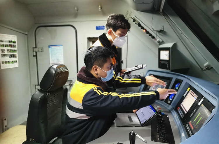 劉柯和師傅確認(rèn)列車運(yùn)行參數(shù)。