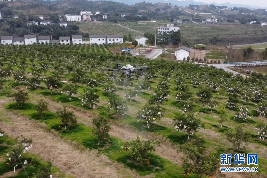 一架植保無人機正在渝北區(qū)大盛鎮(zhèn)青龍村的果園內(nèi)噴灑營養(yǎng)液。新華網(wǎng) 耿駿宇 攝