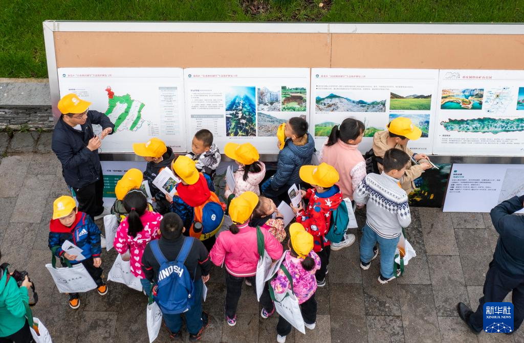 4月17日,參加活動(dòng)的中小學(xué)生在地質(zhì)專(zhuān)業(yè)工作人員的帶領(lǐng)下,對(duì)銅鑼山礦山公園的地質(zhì)遺跡和生態(tài)修復(fù)進(jìn)行科學(xué)考察(無(wú)人機(jī)照片)。