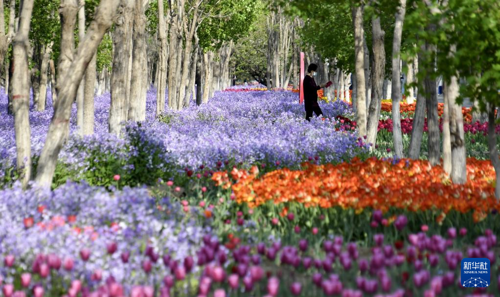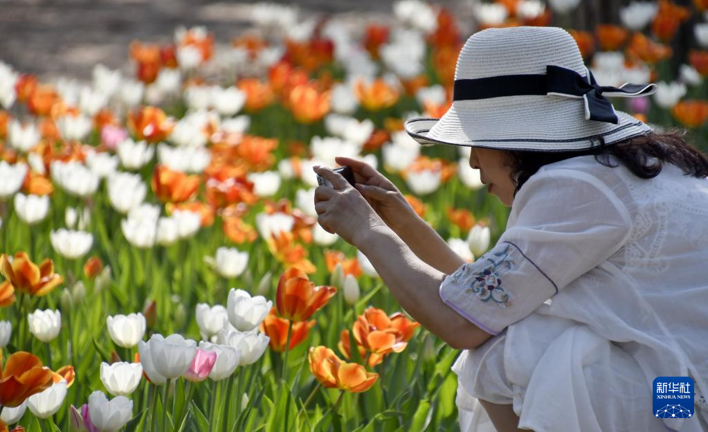 4月19日,游人在北臧村鎮(zhèn)永定河畔的綠色港灣內(nèi)拍攝盛開(kāi)的郁金香。