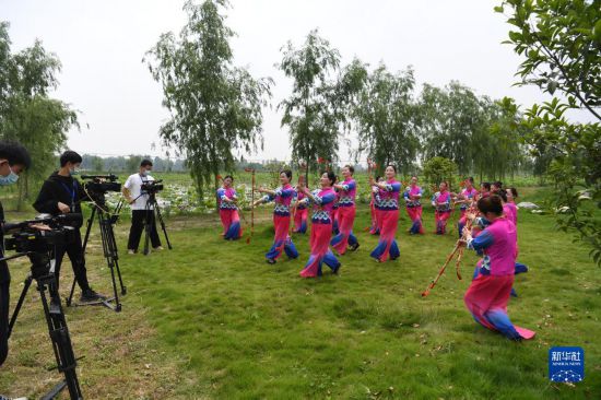5月15日,肥西縣柿樹(shù)崗鄉(xiāng)村民通過(guò)“云上”直播表演當(dāng)?shù)貍鹘y(tǒng)非遺文化項(xiàng)目蓮湘舞。新華社記者劉軍喜攝