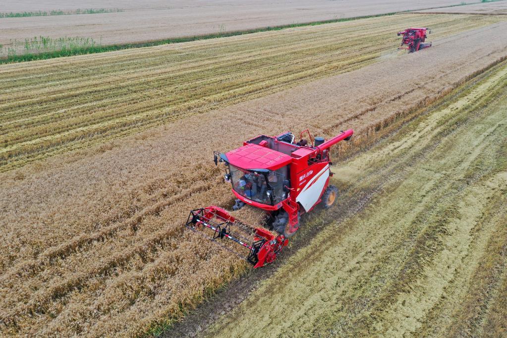 位于安徽省宿松縣的華陽河農場機收小麥現(xiàn)場。新華社發(fā) 李龍 攝