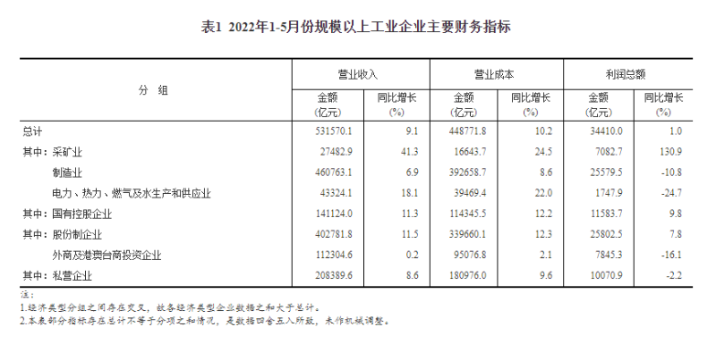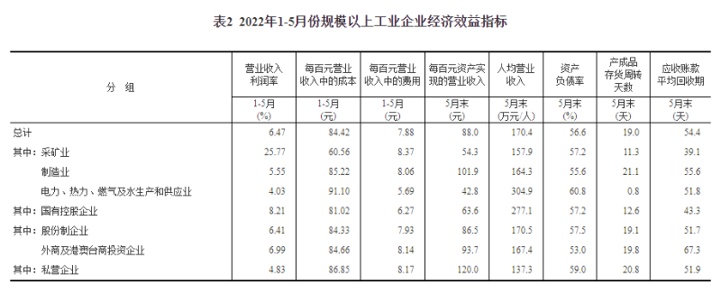 表1 2022年1-5月份規(guī)模以上工業(yè)企業(yè)主要財(cái)務(wù)指標(biāo)