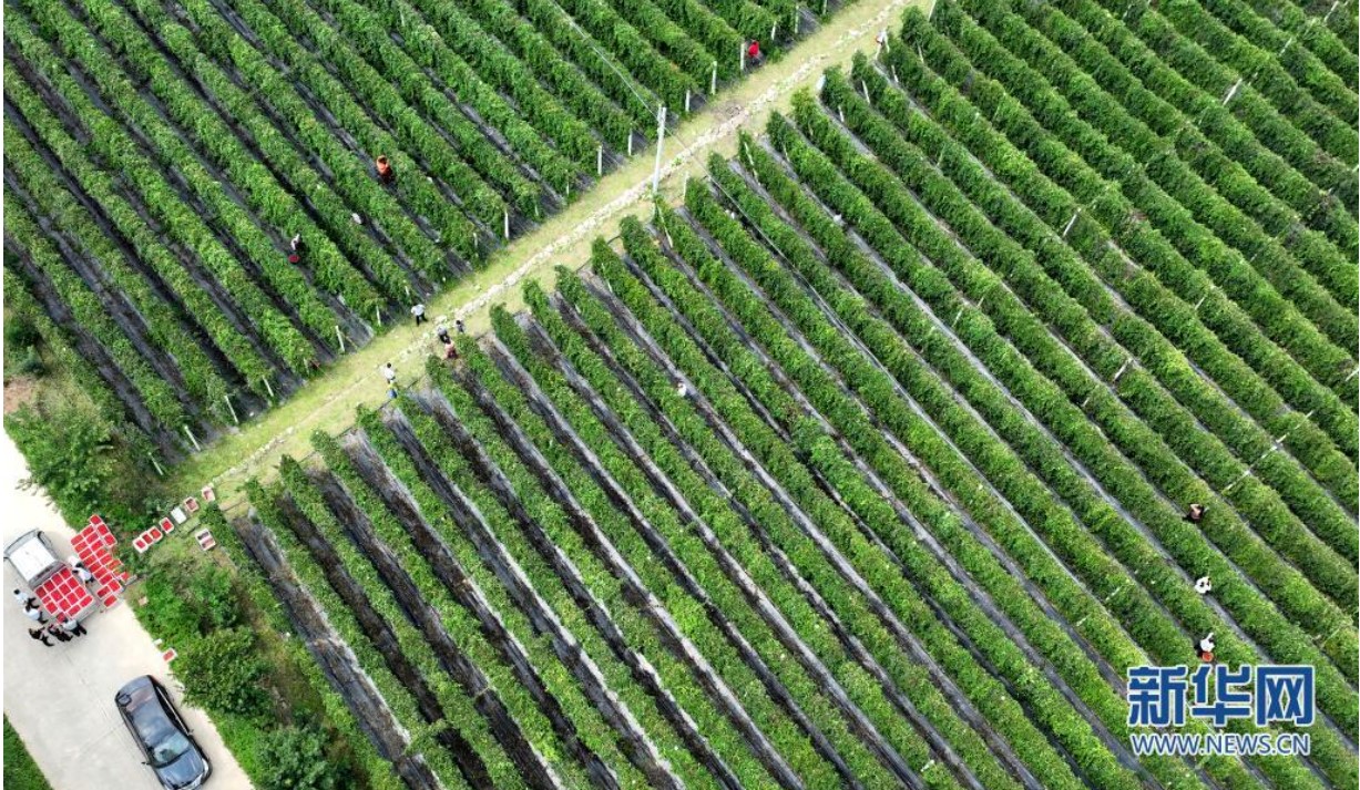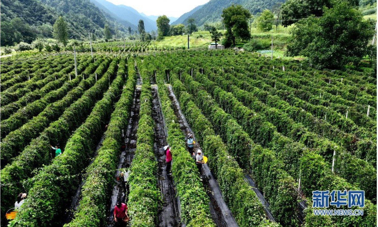 8月21日,洛南縣煜正中藥材專(zhuān)業(yè)合作社的員工在田間采摘五味子(無(wú)人機(jī)照片)。新華社記者 陶明 攝
