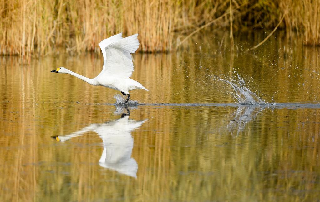 天鵝在烏梁素海水面上嬉戲(2020年10月28日攝)。新華社記者 連振 攝