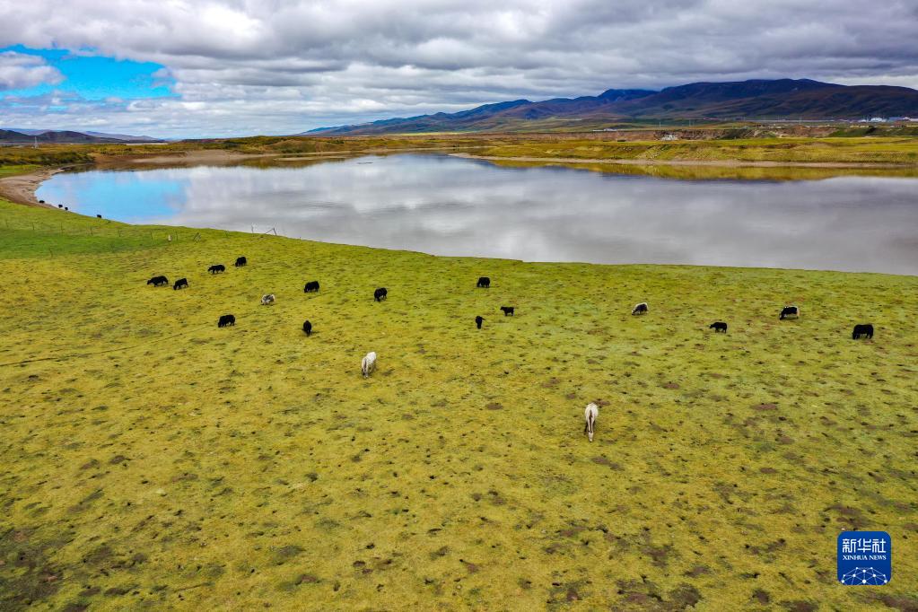 牛群和馬在黃河瑪曲段干流沿岸的一處草地上吃草(9月17日攝,無(wú)人機(jī)照片)。瑪曲縣在2019年就實(shí)現(xiàn)了草畜平衡。新華社記者 郎兵兵 攝