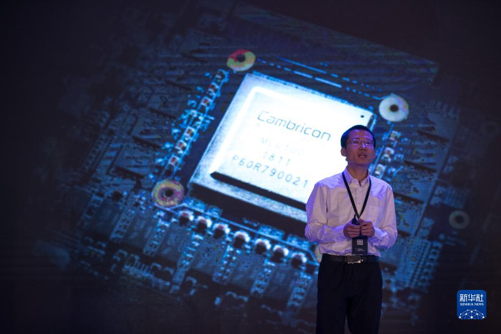 在上海國際會議中心舉行的發(fā)布會上,寒武紀科技公司首席執(zhí)行官陳天石介紹國內首款云端人工智能芯片(2018年5月3日攝)。新華社記者 金立旺 攝