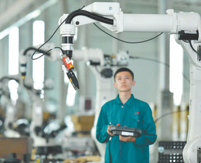 河北省任丘市通過搭建科技創(chuàng)新平臺,建設(shè)研發(fā)中心、技術(shù)研究院,持續(xù)深化產(chǎn)學(xué)研合作交流,推動企業(yè)轉(zhuǎn)型升級。圖為工作人員在生產(chǎn)車間調(diào)試機器人。 |
