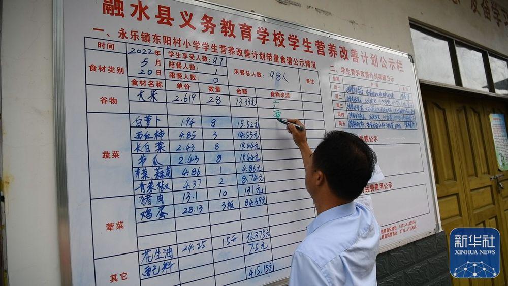 5月20日,在廣西融水苗族自治縣東陽村小學食堂,校長藍正立在告示牌上寫菜譜。新華社記者 張愛林 攝