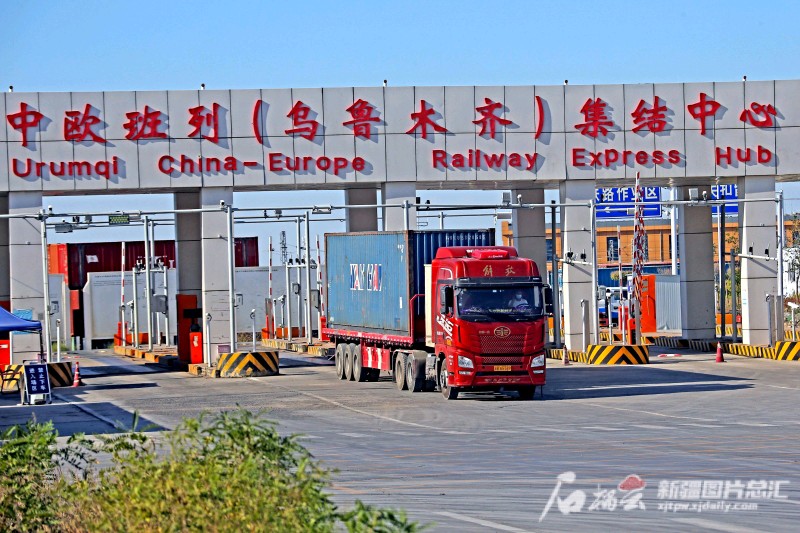 7月14日,一臺卡車從烏魯木齊國際陸港區(qū)中歐班列(烏魯木齊)集結(jié)中心駛出(資料圖片)。 石榴云/新疆日報(bào)記者 蔡增樂攝