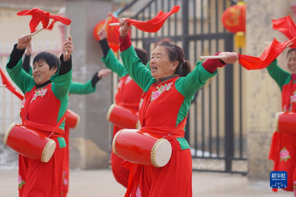 河北省邢臺市內(nèi)丘縣史村屯村村民在廣場排練腰鼓(2022年1月29日攝)。新華社發(fā)(劉繼東 攝)