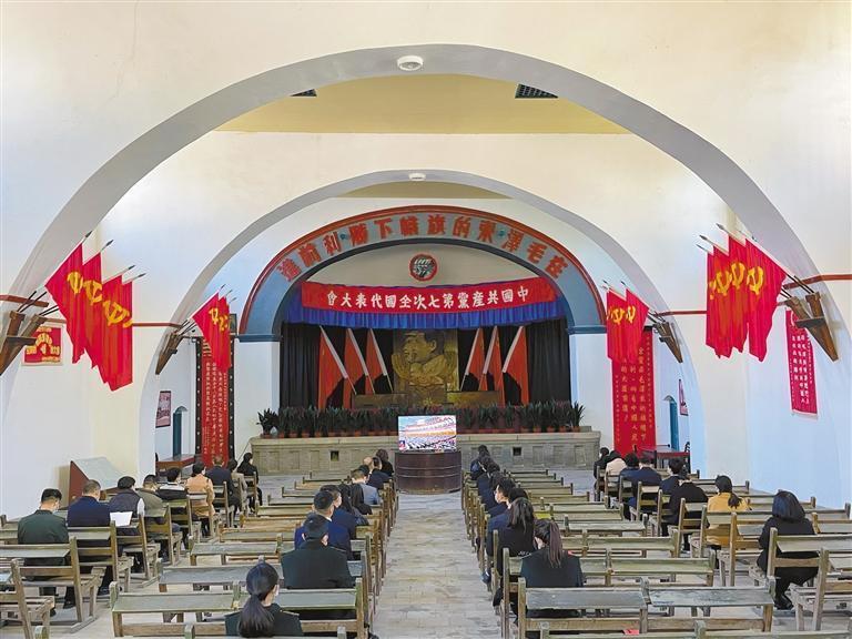 10月16日,延安革命紀(jì)念地管理局的40多名黨員干部職工在楊家?guī)X革命舊址中共七大會(huì)址集中收看黨的二十大開幕會(huì)。記者 陳宏江攝