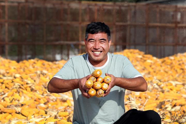 9月22日,在河南焦作博愛(ài)縣磨頭鎮(zhèn)崔莊村,“70后”崔衛(wèi)民展示今年豐收的玉米。新華社發(fā)(程全 攝)