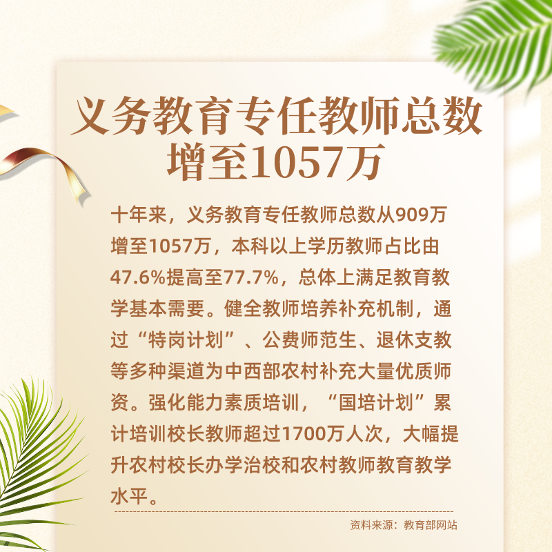 十年來(lái),國(guó)家先后出臺(tái)多個(gè)高規(guī)格的重磅文件,各級(jí)黨委政府認(rèn)真落實(shí)中央要求,各級(jí)教育部門和中小學(xué)校積極作為,推動(dòng)義務(wù)教育取得歷史性成就。尤其是這十年間,在全面普及的基礎(chǔ)上,實(shí)現(xiàn)縣域基本均衡發(fā)展,成為我國(guó)義務(wù)教育發(fā)展史上又一座重要的里程碑。