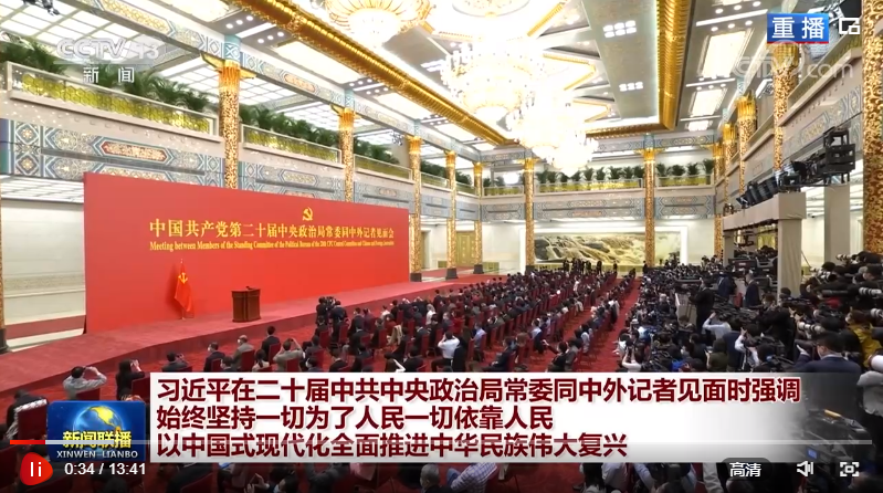 剛剛在中國(guó)共產(chǎn)黨第二十屆中央委員會(huì)第一次全體會(huì)議上當(dāng)選的中共中央總書(shū)記習(xí)近平和中共中央政治局常委李強(qiáng)、趙樂(lè)際、王滬寧、蔡奇、丁薛祥、李希,23日中午在人民大會(huì)堂同采訪中共二十大的中外記者親切見(jiàn)面。