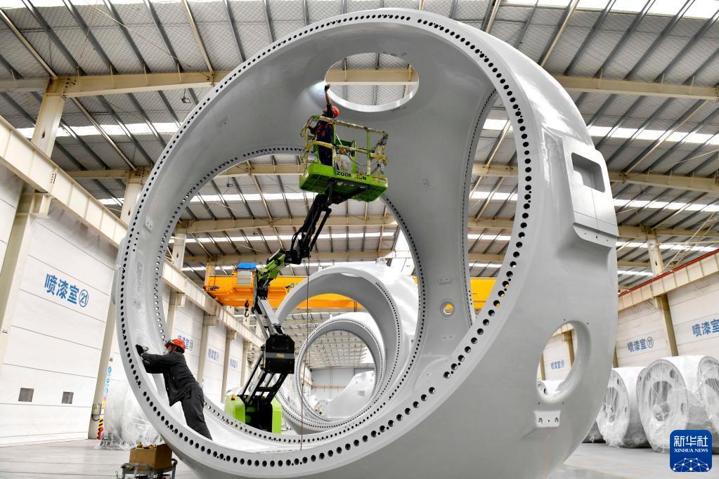 在山東省惠民縣風電裝備產(chǎn)業(yè)基地涂裝車間,工作人員對風電輪轂進行涂裝(2022年6月7日攝)。新華社記者 郭緒雷 攝
