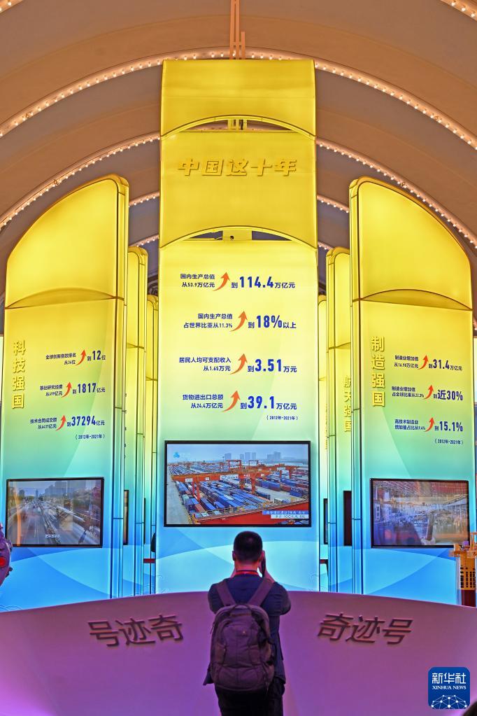 觀眾在“奮進新時代”主題成就展中央綜合展區(qū)內(nèi)拍攝中國經(jīng)濟“奇跡號”巨輪模型(2022年10月8日攝)。新華社記者 李鑫 攝