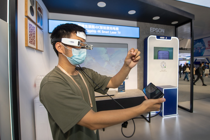 11月10日,觀眾在愛普生公司展臺體驗AR感知交互眼鏡系統(tǒng)。新華社記者 江漢 攝