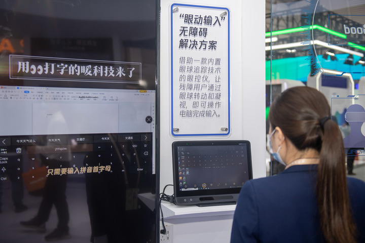 11月10日,觀眾在騰訊公司展臺體驗“眼動輸入”無障礙解決方案。新華社記者 江漢 攝