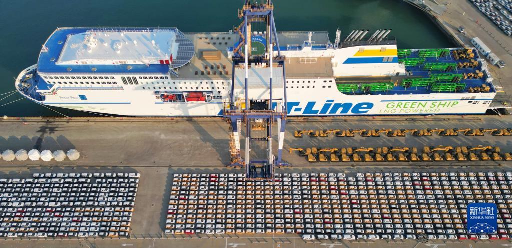 12月7日,出口商品車在山東港口煙臺(tái)港集結(jié)裝船(無人機(jī)照片)。新華社發(fā)(唐克 攝)