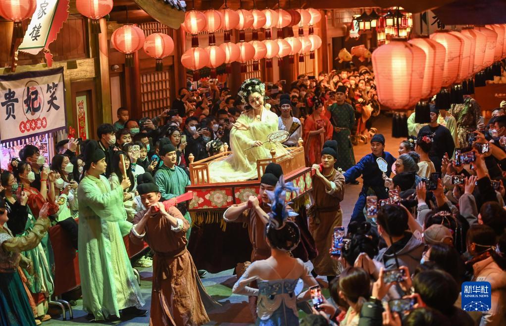 2022年12月31日,游客在陜西西安長安十二時(shí)辰主題街區(qū)觀看表演。新華社發(fā)(鄒競一 攝)