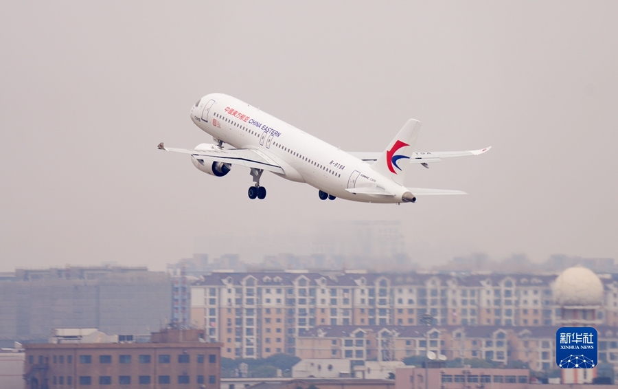 2022年12月26日,國產(chǎn)大飛機(jī)C919在上海虹橋國際機(jī)場起飛。 當(dāng)日,國產(chǎn)大飛機(jī)C919交付東航的全球首架機(jī)的首班驗證飛行開啟,從上海虹橋國際機(jī)場飛往北京首都國際機(jī)場。 新華社發(fā)