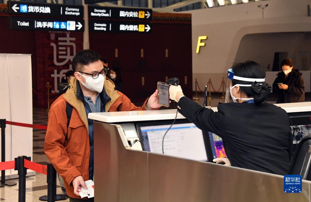 1月17日,在北京大興機場,海關關員準備核驗乘坐CZ309次北京飛往香港航班旅客的海關健康申報二維碼。新華社記者 任超 攝