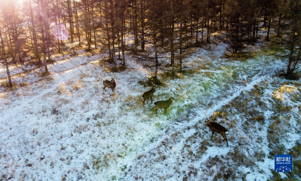 1月29日,一群馬鹿在灤河源國家森林公園內覓食(無人機照片)。新華社記者 賀書琛 攝