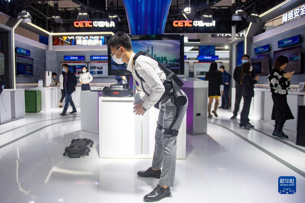 在浙江烏鎮(zhèn)舉辦的2022年“互聯(lián)網(wǎng)之光”博覽會上,中國電科工作人員為觀眾演示外骨骼機(jī)器人的使用(2022年11月8日攝)。新華社記者 江漢 攝