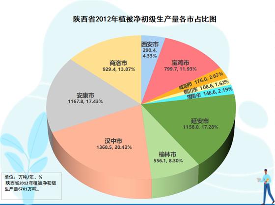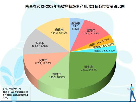 2012-2022年分市元生產(chǎn)量增長貢獻分析結(jié)果表明,各市對全省生態(tài)蛋糕增長均有所貢獻,但各市的貢獻大小差異很大,在生態(tài)蛋糕中的地位也隨之有所變化。全國退耕還林策源地美稱的延安是全省生態(tài)蛋糕增量最大的市,10年增加247.9萬噸,為全省生態(tài)蛋糕增加量貢獻了24.9個百分點。商洛第二,10年增加131.3萬噸,為全省貢獻13.2個百分點。安康第三,10年增加129.3萬噸,為全省貢獻13.0個百分點。漢中第四,增加125.2萬噸,為全省貢獻12.6個百分點。其后,依次分別是寶雞增加113.2萬噸、為全省貢獻11.4%,榆林增加108.9萬噸、為全省貢獻10.9%,西安增加53.7萬噸、為全省貢獻5.4%,咸陽增加37.6萬噸、為全省貢獻3.8%,渭南增加34.4萬噸、為全省貢獻3.4%,銅川增加24.9萬噸、為全省貢獻1.5%。