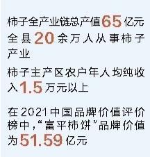 種植面積36萬(wàn)畝、掛果面積18萬(wàn)畝,鮮柿產(chǎn)量28萬(wàn)噸,加工柿餅7萬(wàn)噸,銷售柿餅6萬(wàn)噸以上,柿子全產(chǎn)業(yè)鏈產(chǎn)值達(dá)65億元……