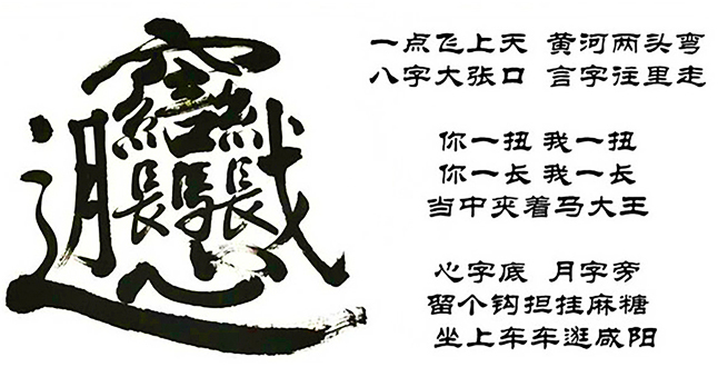 可“biang”字怎么寫(xiě)?秀才拿出筆墨,寫(xiě)出了以下口訣:一點(diǎn)飛上天,黃河兩邊彎;八字大張口,言字往里走,左一扭,右一扭;西一長(zhǎng),東一長(zhǎng),中間加個(gè)馬大王;心字底,月字旁,留個(gè)勾搭掛麻糖;推個(gè)車車逛咸陽(yáng)。于是就有了今天的“biang”字。
