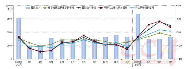 中國烹飪協(xié)會結合往年數(shù)據(jù)分析指出,2023年5月份全國餐飲收入、限上餐飲收入增速較去年同期上升56.2個、52.2個百分點。1-5月,全國餐飲收入、限上餐飲收入增速較去年同期上升31.1個、34.5個百分點,餐飲收入占社會消費品零售總額的10.6%。