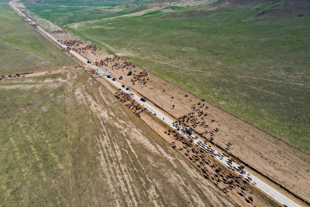 6月15日,牧民們趕著畜群行走在遷徙道路上(無人機(jī)照片)。新華社記者 連振攝