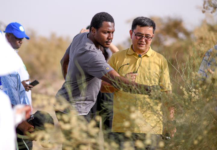 來(lái)自尼日利亞的非洲荒漠化控制倡議組織負(fù)責(zé)人奧馬爾·丹拉迪·達(dá)希魯?shù)弥笏髽溆心秃?、耐鹽堿地等特點(diǎn),他找到中國(guó)科學(xué)院新疆生態(tài)與地理研究所研究員徐新文,邊說邊比劃,想知道梭梭樹能否通過扦插而不是播種培育。