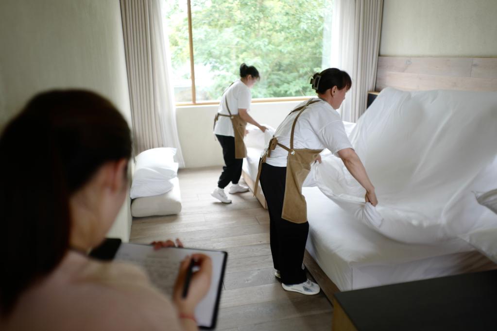 學員在莫干山民宿管家培訓中心內進行房務考核。新華社記者徐中哲 攝