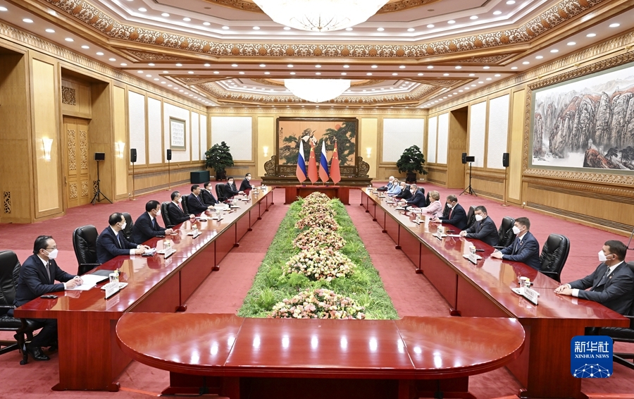 習(xí)近平指出,在雙方共同努力下,中俄關(guān)系始終保持健康穩(wěn)定發(fā)展勢頭,各領(lǐng)域合作穩(wěn)步推進(jìn),兩國世代友好的社會基礎(chǔ)和民意基礎(chǔ)更加牢固。今年3月,我對俄羅斯進(jìn)行國事訪問,同普京總統(tǒng)就深化兩國全面戰(zhàn)略協(xié)作和各領(lǐng)域務(wù)實合作達(dá)成新的重要共識。發(fā)展中俄關(guān)系是兩國基于各自國家和人民根本利益作出的戰(zhàn)略選擇。中方愿繼續(xù)同俄方一道,發(fā)展守望相助、深度融通、開拓創(chuàng)新、普惠共贏的新時代全面戰(zhàn)略協(xié)作伙伴關(guān)系,助力兩國發(fā)展振興,推動建設(shè)繁榮穩(wěn)定、公平公正的世界。