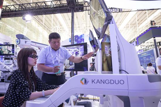 在黑龍江省哈爾濱市舉辦的2022世界5G大會展廳里,參展商現(xiàn)場演示5G遠(yuǎn)程手術(shù)機器人(2022年8月10日攝)。新華社記者 張濤 攝