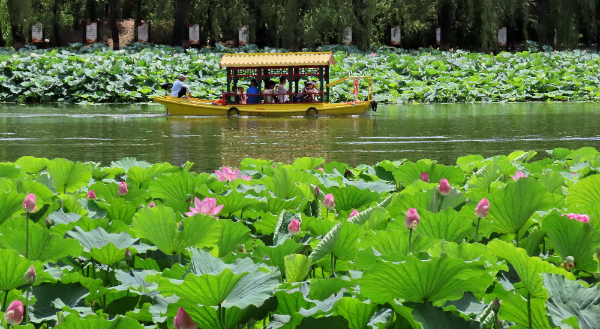 隨著暑假的到來,各地迎來暑期旅游旺季。7月9日,游人在北京市圓明園遺址公園內(nèi)乘船游玩。新華社記者 李欣 攝