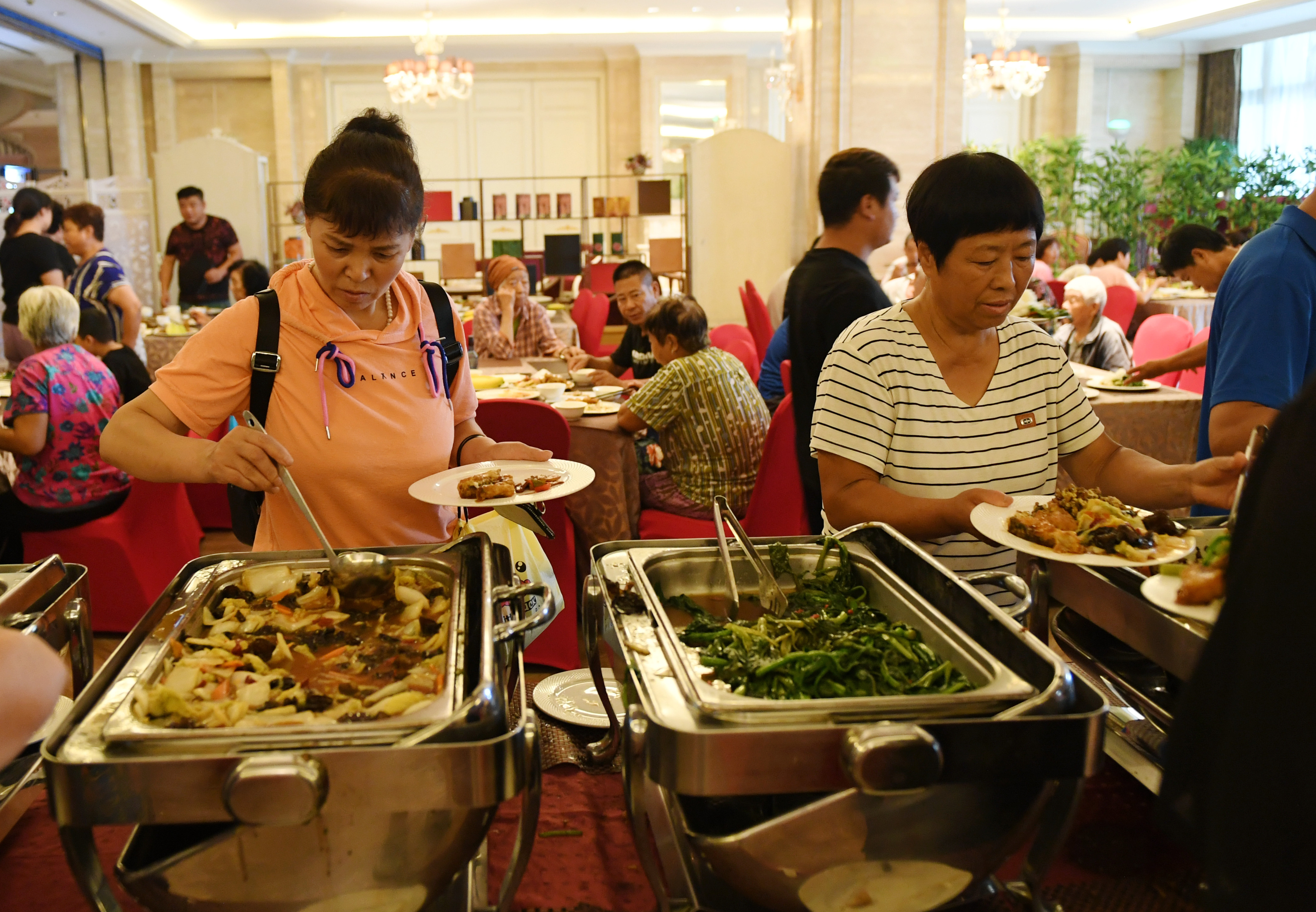 8月1日,北京市房山區(qū)青龍湖鎮(zhèn)的村民在臨時(shí)安置點(diǎn)用餐。新華社記者 張晨霖 攝