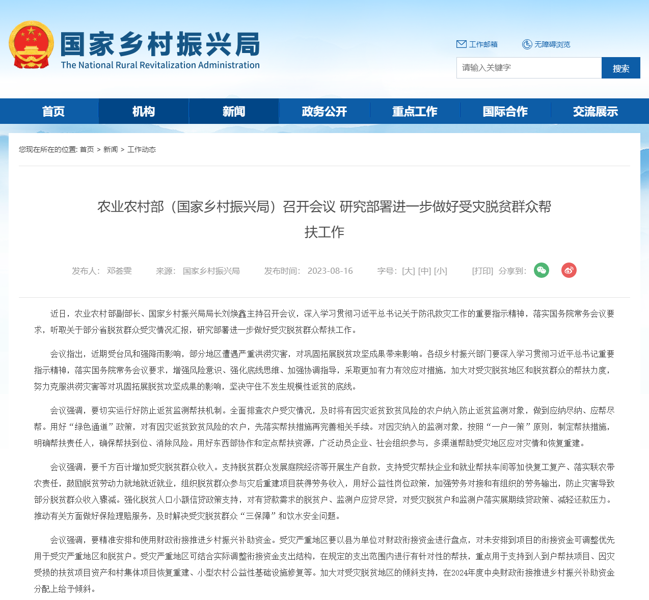央視網(wǎng)消息:近日,農(nóng)業(yè)農(nóng)村部(國(guó)家鄉(xiāng)村振興局)召開(kāi)會(huì)議,要求各級(jí)鄉(xiāng)村振興部門(mén)加大對(duì)受災(zāi)脫貧地區(qū)和脫貧群眾的幫扶力度,努力克服洪澇災(zāi)害等對(duì)鞏固拓展脫貧攻堅(jiān)成果的影響,堅(jiān)決守住不發(fā)生規(guī)模性返貧的底線。