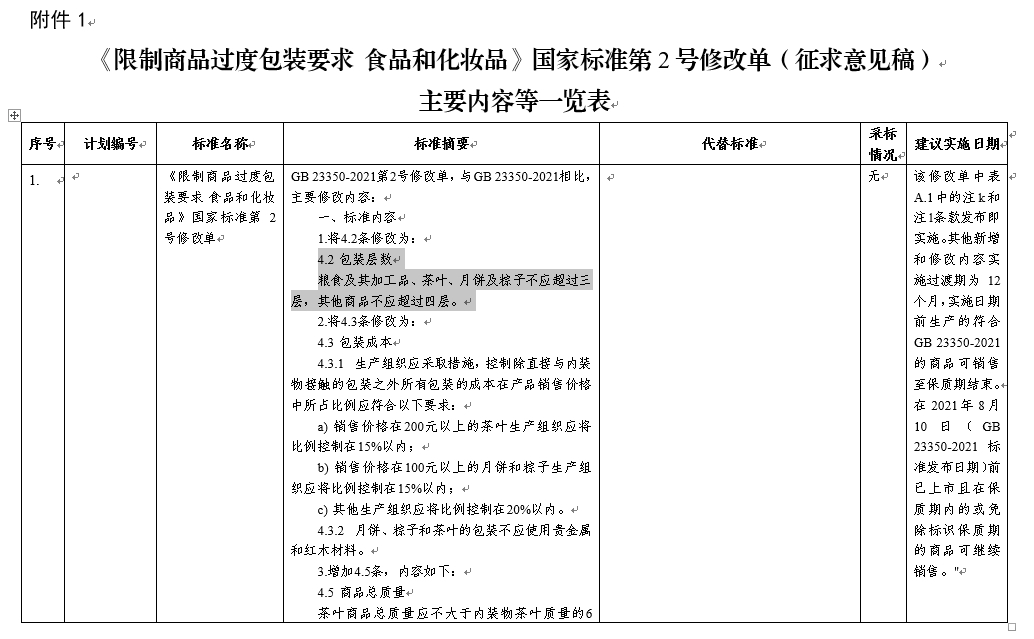 央視網(wǎng)消息:據(jù)工業(yè)和信息化部,根據(jù)國家標(biāo)準(zhǔn)委下達(dá)的強(qiáng)制性國家標(biāo)準(zhǔn)制修訂計劃,工業(yè)和信息化部組織完成了《限制商品過度包裝要求 食品和化妝品》強(qiáng)制性國家標(biāo)準(zhǔn)第2號修改單(征求意見稿)的編制工作。為進(jìn)一步聽取社會各界意見,現(xiàn)對標(biāo)準(zhǔn)征求意見稿及編制說明予以公示,截止日期2023年9月17日。