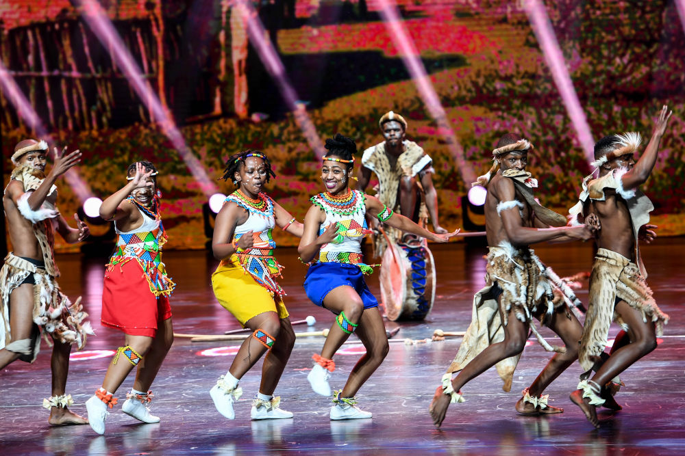 來自南非的演員在中國(guó)內(nèi)蒙古呼和浩特市舉行的第十一屆中國(guó)國(guó)際民間藝術(shù)節(jié)上表演《祖魯歌舞》(2019年8月23日攝)。