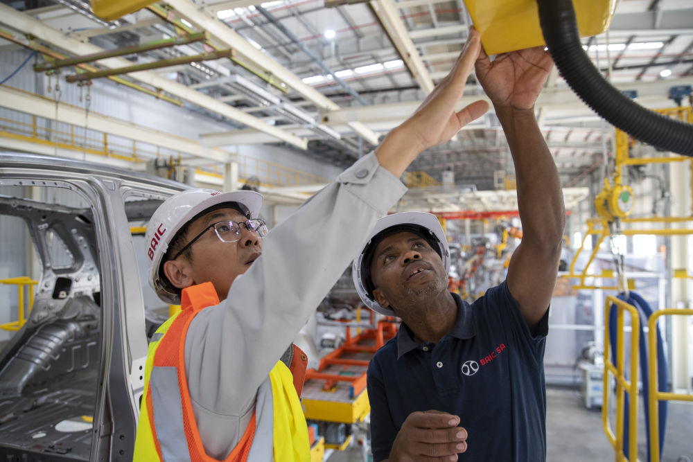在南非東開普省北汽南非工廠,南非員工邦加尼(右)與中國(guó)同事方龍一起工作(2023年5月9日攝)。2022年,中國(guó)汽車品牌在南非的銷量突破3.5萬臺(tái),2023年預(yù)計(jì)將突破4萬臺(tái)。