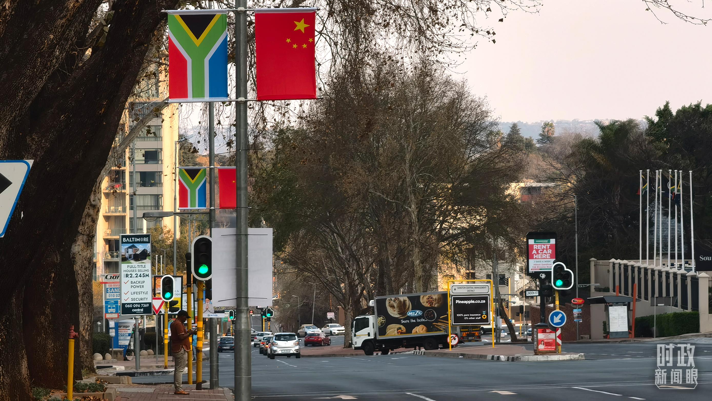 △約翰內斯堡街道兩側懸掛的中國國旗。(總臺央視記者韓銳拍攝)