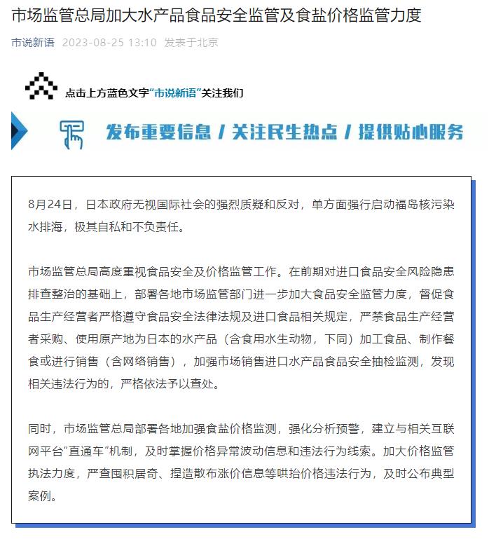 市場(chǎng)監(jiān)管總局高度重視食品安全及價(jià)格監(jiān)管工作。在前期對(duì)進(jìn)口食品安全風(fēng)險(xiǎn)隱患排查整治的基礎(chǔ)上,部署各地市場(chǎng)監(jiān)管部門(mén)進(jìn)一步加大食品安全監(jiān)管力度,督促食品生產(chǎn)經(jīng)營(yíng)者嚴(yán)格遵守食品安全法律法規(guī)及進(jìn)口食品相關(guān)規(guī)定,嚴(yán)禁食品生產(chǎn)經(jīng)營(yíng)者采購(gòu)、使用原產(chǎn)地為日本的水產(chǎn)品(含食用水生動(dòng)物,下同)加工食品、制作餐食或進(jìn)行銷(xiāo)售(含網(wǎng)絡(luò)銷(xiāo)售),加強(qiáng)市場(chǎng)銷(xiāo)售進(jìn)口水產(chǎn)品食品安全抽檢監(jiān)測(cè),發(fā)現(xiàn)相關(guān)違法行為的,嚴(yán)格依法予以查處。