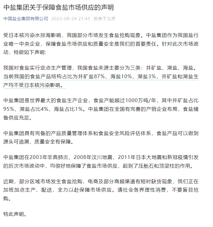 受日本核污染水排海影響,我國部分市場發(fā)生食鹽搶購現(xiàn)象。中鹽集團(tuán)作為我國鹽行業(yè)唯一中央企業(yè),保障食鹽市場供應(yīng)和質(zhì)量安全是我們的首要責(zé)任。針對此次市場波動,特做如下聲明: